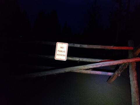 We rode on into the dark. I'm not going to lie — we were exhausted at this point. The day was nearing the 12-hour mark, and the campground we had been aiming for looked too lit up and potentially populated for us to feel comfortable stealth camping there. We were both edgy on the dark roads, especially as they rolled on and on through the park without any sign of a next campground to try. Though we were fried, we ended up biking almost a full 10 miles extra, till we were almost at Jenny Lake (it's south of Jackson Lake and a little smaller and, we'd been told, really beautiful, though right now everything was pitch black). The proverbial end of our rope was seriously starting to fray when we found the turn-off for Jenny Lake Lodge. Also closed, of course, but we risked it. It was possibly supposed to snow that night, and after tiptoeing around the Lodge and its adjacent cabins, we decided it would do. We pitched our tent on the concrete "porch" under the overhang of one of the cabins — plus side, it would keep us out of any snow that might come; downside, the winds were still whipping at us and we couldn't stake it down. So we got it up and filled it with our bags as fast as we could, then with ourselves.