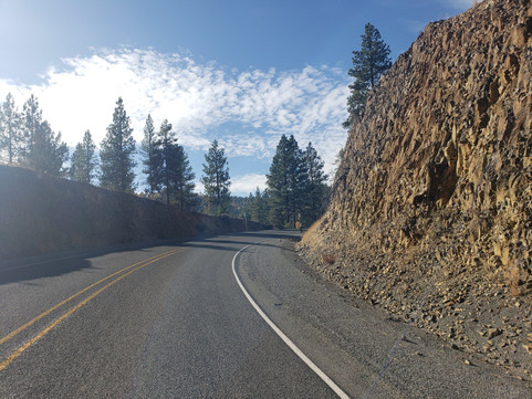 Relieved and restored, we started up our last pass. As we climbed, I was keeping an eye on my phone for any snippet of signal that might slip through. All day I'd been pretty much in a dead zone, but now that we were feeling confident—like we might just make it all the way to John Day—I was attempting to coordinate a place for us to stay. Rachel (of wonderful Rachel and Patrick back in Boise) had mentioned having a contact in John Day. So far, we'd managed to glean that his name was Jerry and he was probably happy to have us, but also he doesn't have a phone. But he has internet! So... check your email when you can for his address? It's funny how this kind of semi-flying-by-the-seat-of-our-pants might have stressed me out a couple of months ago. Now, it's just how we live. Where are we staying tonight? We'll see — there's miles yet to go. The final climb was the only one graced with a name — Dixie Pass, summit elevation 5,277 feet. (Though we did give each of the climbs a name, all in honor of the three prodigious cats we've met along our journey: Tiger Mountain, Yedi Ridge, and Boris Pass.)